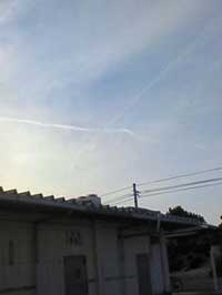 買い物に行ったら、飛行機雲が見事にクロスしてました。飛行機雲の世界!